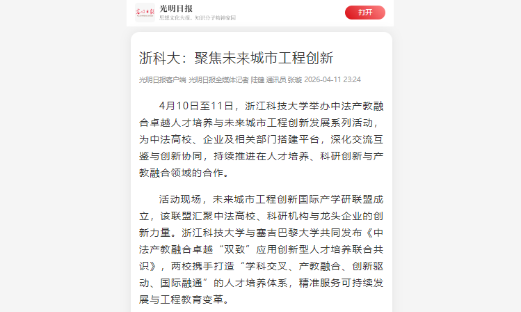4月10日至11日,浙江科技大学举办中法产教融合卓越人才培养与未来城市工程创新发展系列活动,为中法高校、企业及相关部门搭建平台,深化交流互鉴与创新协同,持续推进在人才培养、科研创新与产教融合领域的合作。光明日报客户端、中国教育在线、潮新闻客户端、杭州网等媒体对系列活动进行了报道。光明日报客户端:浙科大:聚焦未来城市工程创新中国教育在线:浙科大中法合作再升级 聚焦未来城市工程创新产教融合潮新闻客户端:...