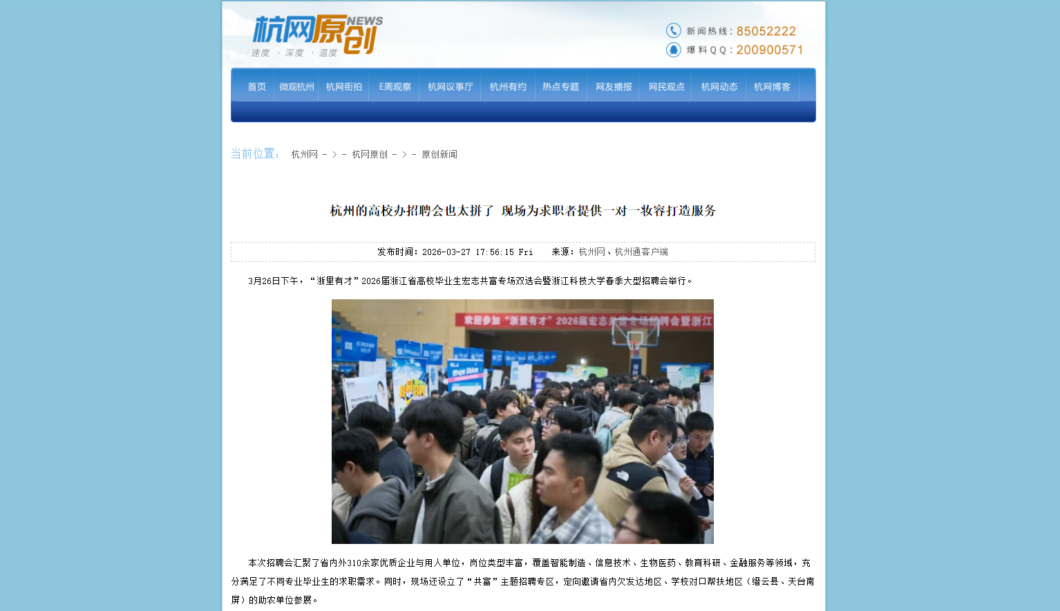 3月26日下午,“浙里有才”2026届浙江省高校毕业生宏志共富专场双选会暨浙江科技大学春季大型招聘会举行。本次招聘会汇聚了省内外310余家优质企业与用人单位,岗位类型丰富,覆盖智能制造、信息技术、生物医药、教育科研、金融服务等领域,充分满足了不同专业毕业生的求职需求。同时,现场还设立了“共富”主题招聘专区,定向邀请省内欠发达地区、学校对口帮扶地区(缙云县、天台南屏)的助农单位参展。活动现场,各企业展位前...
