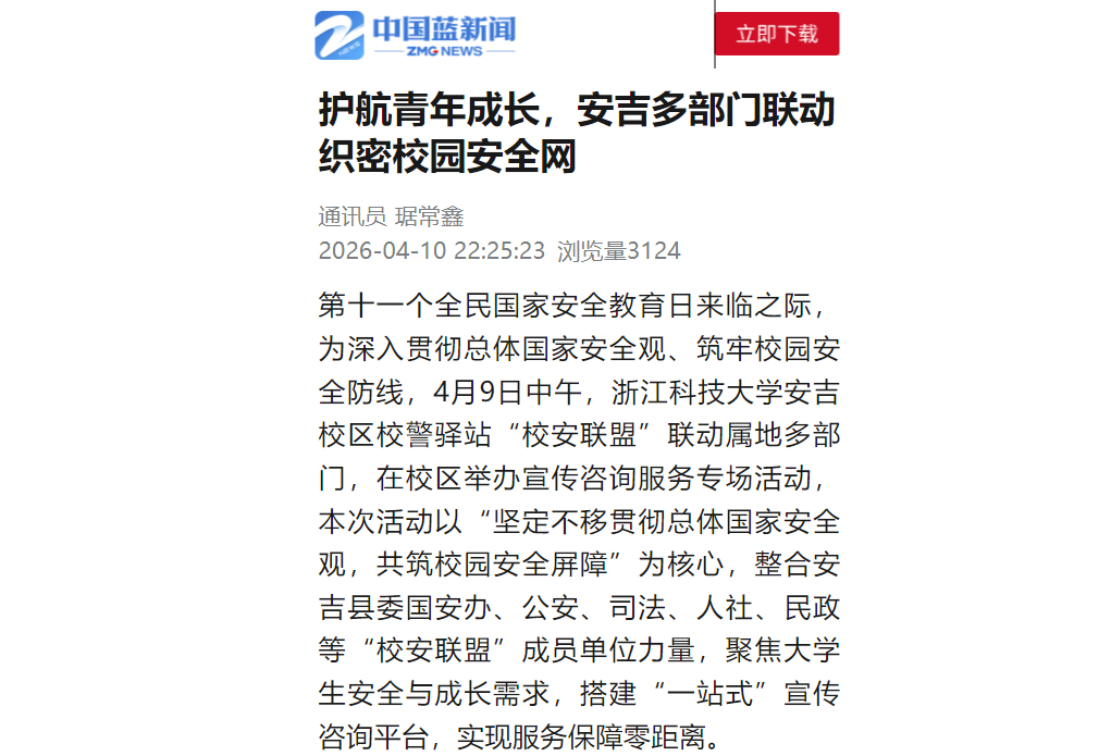 第十一个全民国家安全教育日来临之际,为深入贯彻总体国家安全观、筑牢校园安全防线,4月9日中午,浙江科技大学安吉校区校警驿站“校安联盟”联动属地多部门,在校区举办宣传咨询服务专场活动,本次活动以“坚定不移贯彻总体国家安全观,共筑校园安全屏障”为核心,整合安吉县委国安办、公安、司法、人社、民政等“校安联盟”成员单位力量,聚焦大学生安全与成长需求,搭建“一站式”宣传咨询平台,实现服务保障零距离。活动现...