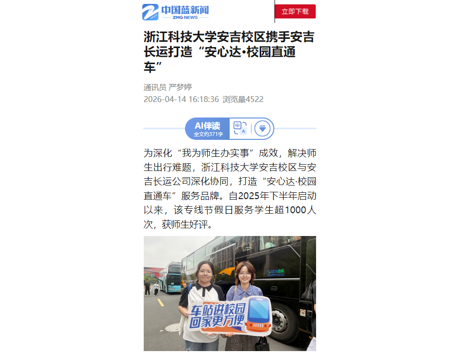 为深化“我为师生办实事”成效,解决师生出行难题,浙江科技大学安吉校区与安吉长运公司深化协同,打造“安心达·校园直通车”服务品牌。自2025年下半年启动以来,该专线节假日服务学生超1000人次,获师生好评。自本学期伊始,“安心达·校园直通车”升级。重点增设安吉往返杭州线路站点,拓宽出行范围;推出多层次票价体系,优化购票流程,降低学生成本,彰显校区“服务育人”初心。此次校企合作是校地融合、协同育人的实践。校...