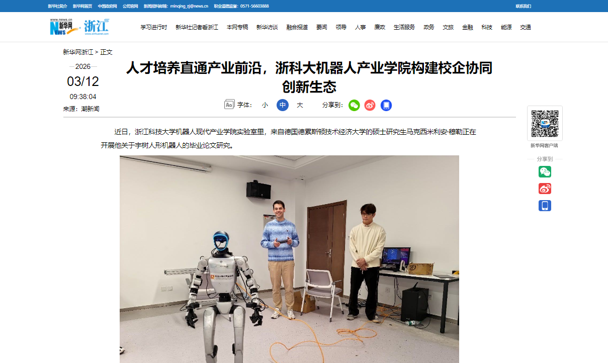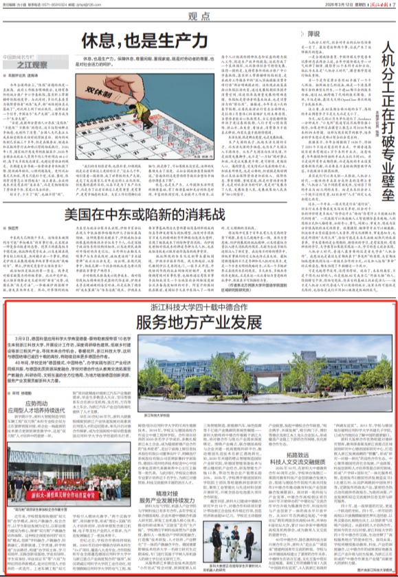 3月12日出版的《浙江日报》,以《浙江科技大学四十载中德合作,服务地方产业发展》为题,关注我校40年间坚持“德国模式、中国特色”,办学实践与浙江产业经济同频共振、与德国优质资源深度融合,学校对德合作也从教育交流拓展至产教融合、科研协同、文明互鉴的全方位格局,为地方链接德国创新资源、服务产业发展贡献浙科大力量的实践。报道全文如下——浙江科技大学四十载中德合作服务地方产业发展3月9日,德国科堡应用科学大学...