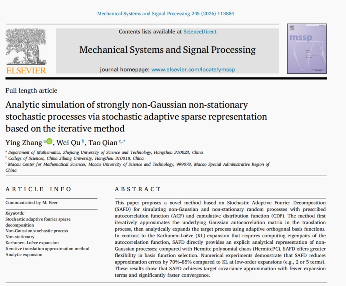 近日,实分析与调和分析及应用团队与合作者在非高斯随机过程模拟与信号分析领域取得重要研究进展,相关成果发表在国际高水平期刊《Mechanical Systems and Signal Processing》,理学院张影博士为第一作者,浙江科技大学为第一完成单位。在这篇题为《Analytic simulation of strongly non-Gaussian non-stationary stochastic processes via stochastic adaptive sparse representation based on the iterative method》(点击...