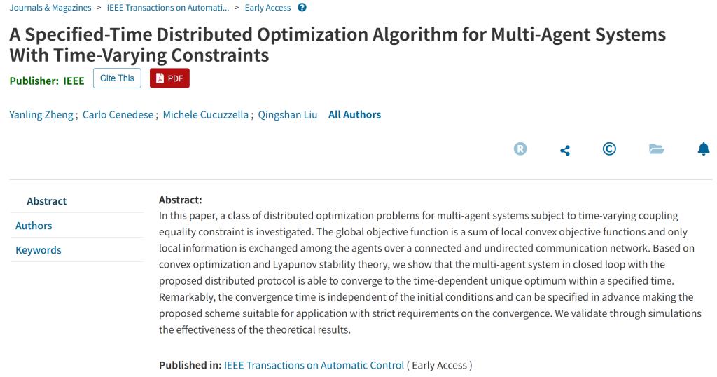 近日,理学院动力系统与可积系统团队郑燕玲博士与合作者在控制领域国际顶级期刊 《IEEE Transactions on Automatic Control》(IEEE TAC)上发表论文 “A Specified-Time Distributed Optimization Algorithm for Multi-Agent Systems With Time-Varying Constraints”(点击阅读)。郑燕玲博士为第一作者,苏黎世联邦理工学院高级研究员Carlo Cenedese 为第二作者,荷兰格罗宁根大学Michele Cucuzzella教授和东南大学刘庆山教授...