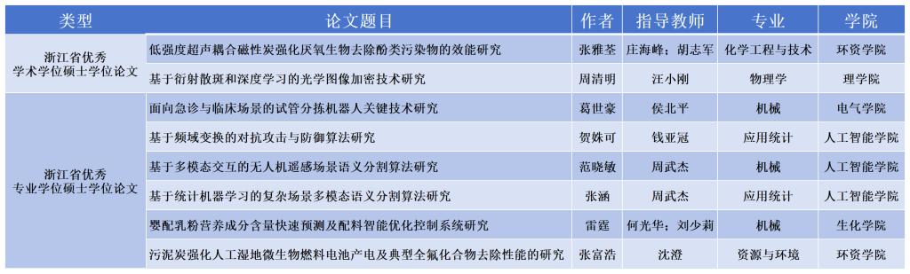 近日,2024年浙江省研究生优秀学位论文评选结果公布,我校8篇硕士学位论文获评优秀,其中优秀学术学位硕士学位论文2篇,优秀专业学位硕士学位论文6篇,获评数量创历史新高。浙江省研究生优秀学位论文和实践成果的评选,旨在提高我省研究生学位论文和实践成果质量,激发研究生创新精神,提高研究生培养质量。根据《浙江省研究生优秀学位论文和实践成果评选办法(试行)》(浙研教字第[2025]12号),本次研究生优秀学位论文评选共...