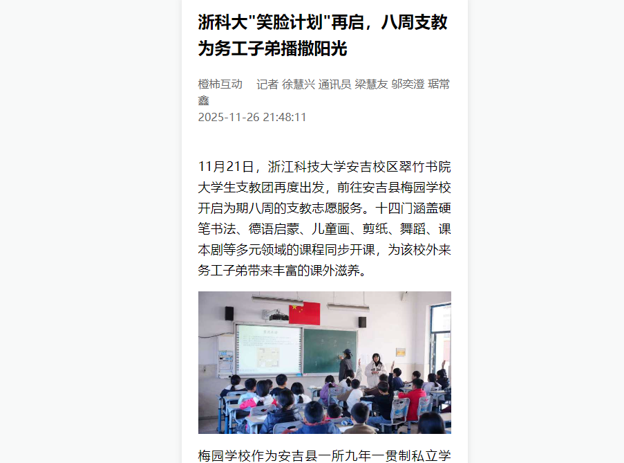 11月21日,浙江科技大学安吉校区翠竹书院大学生支教团再度出发,前往安吉县梅园学校开启为期八周的支教志愿服务。十四门涵盖硬笔书法、德语启蒙、儿童画、剪纸、舞蹈、课本剧等多元领域的课程同步开课,为该校外来务工子弟带来丰富的课外滋养。梅园学校作为安吉县一所九年一贯制私立学校,学生多为当地外来务工人员子女,普遍面临学习水平参差不齐、普通话能力薄弱等问题,部分学生放学后还需承担家务劳动,学习时间受限。“支...
