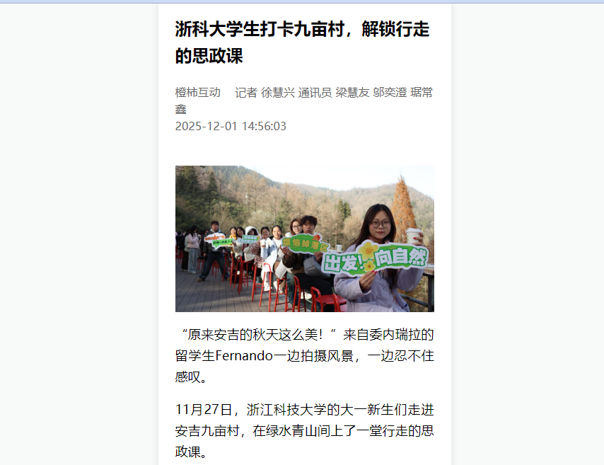 “原来安吉的秋天这么美!”来自委内瑞拉的留学生Fernando一边拍摄风景,一边忍不住感叹。11月27日,浙江科技大学的大一新生们走进安吉九亩村,在绿水青山间上了一堂行走的思政课。九亩村被誉为浙北高山第一村,这里坐落着中国金钱松森林公园,拥有超五万株金钱松。近年来九亩村创新开启“党建统领+整村运营”的发展模式,将绿水青山的自然风光转化为经济效益,成功出圈,将金钱松公园打造成“江浙沪赏秋天花板”。“过去我们不...