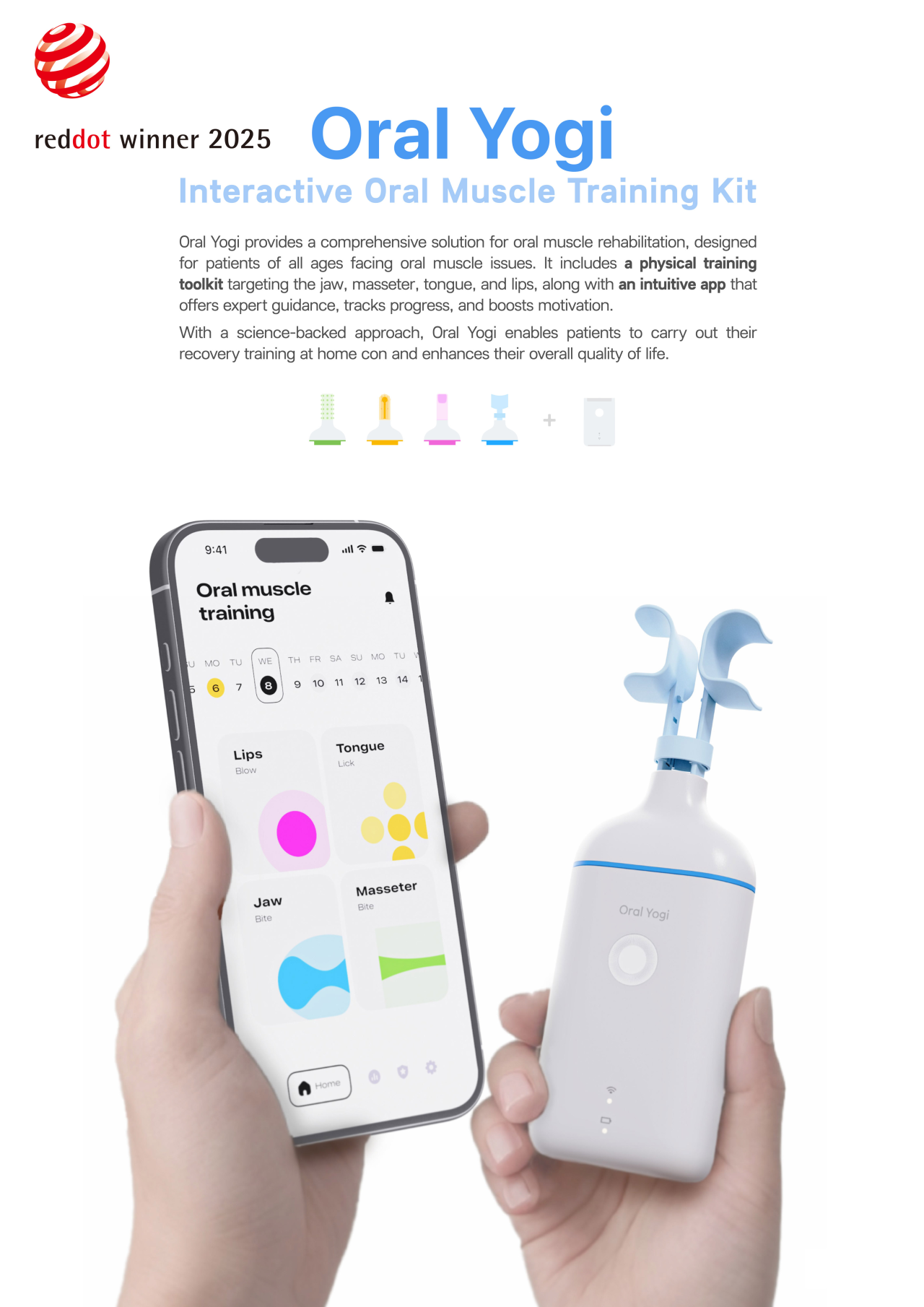 设计说明:Oral Yogi 针对各年龄段口腔肌肉问题人群,打造 “实体工具包 + 智能 APP” 一体化方案。工具包覆盖下颚、颞肌、舌头、嘴唇训练;APP 提供专业指导、进度跟踪与激励。产品适配多类场景,患者无需往返机构,在家、外出均可训练,有效改善咀嚼、吞咽、发音等功能,助力提升整体生活质量。