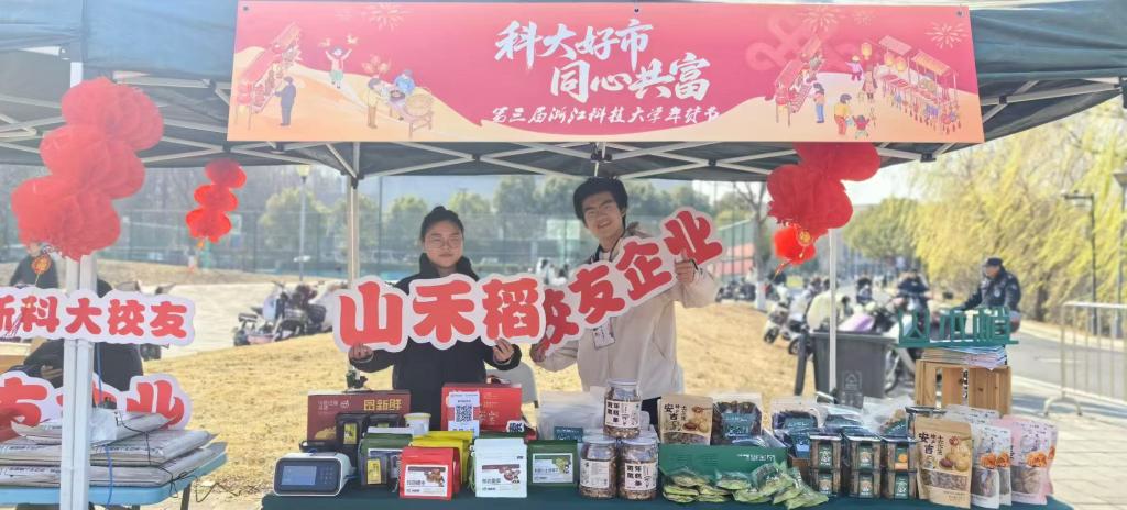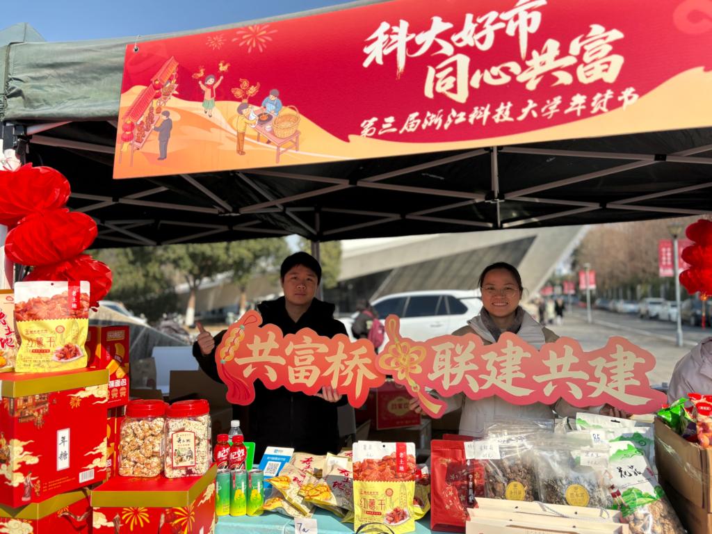 “以前觉得共同富裕离我们很远,但今天看到这么多帮扶产品,听到驻村干部的讲解,感觉参与乡村振兴就在身边。”1月8日至9日,小和山校区学生活动中心西侧广场人头攒动、热闹非凡,在年货节上采购到阿克苏苹果的学生小郭高兴地说道。在为期两天的“科大好市 同心共富”浙江科技大学年货节现场,30余个摊位整齐排列,传统腊味、现制美食、校友产品、帮扶农产品等一应俱全,师生在现场不仅能一站式选购到心仪的土特产,更能感受到浓浓的年味和烟火气。