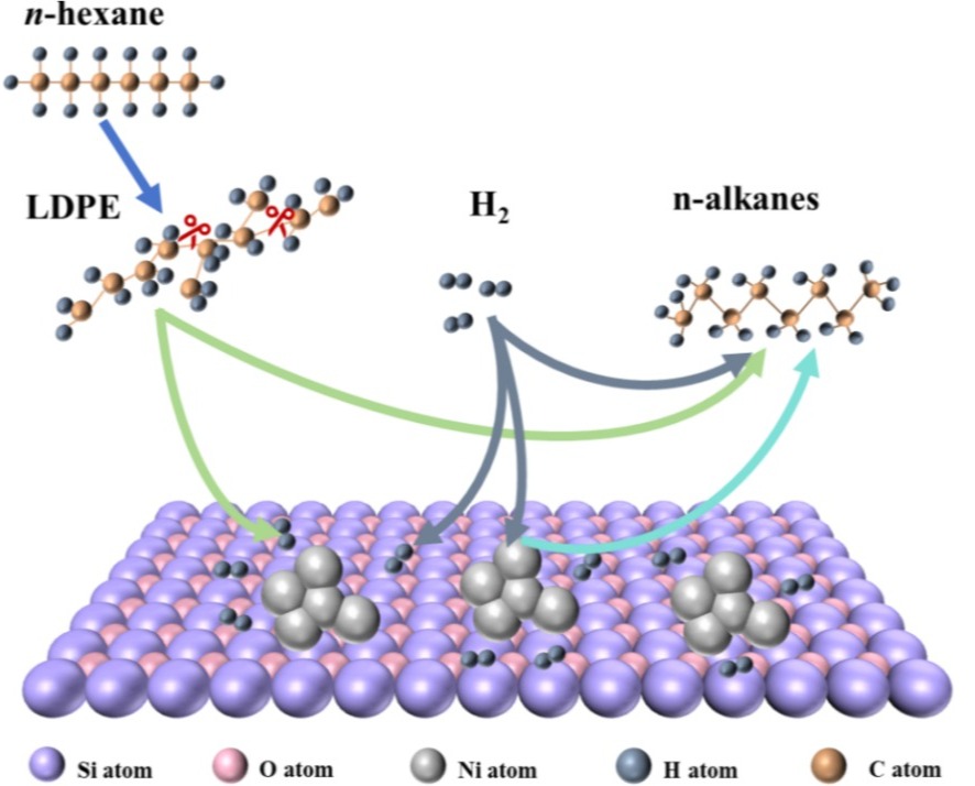 在Journal of the Energy Institute上发表的“Hydrogenolysis of LDPE over Ni-catalyst promoted by n-hexane solvent”,硕士研究生许海峰为第一作者,董聪副教授为通讯作者,浙江科技大学为第一单位。该论文探索了低密度聚乙烯在溶剂介导下的氢解反应,旨在开辟提升塑料回收经济可行性的新路径。通过经济效益与环境友好的协同效益,成功构建并验证了一种聚烯烃废弃物闭环升级回收新模式。