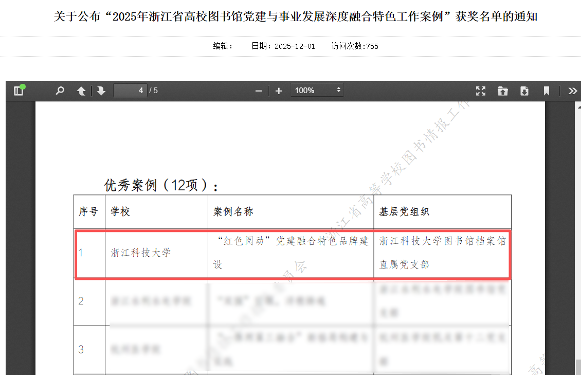 近日,浙江省高校图书情报工作委员会公布2025年省高校图书馆党建与事业发展深度融合特色工作优秀案例评比结果,我校图书馆档案馆直属党支部(以下简称“两馆直支”)报送的“‘红色阅动’党建融合特色品牌建设”入选优秀案例。