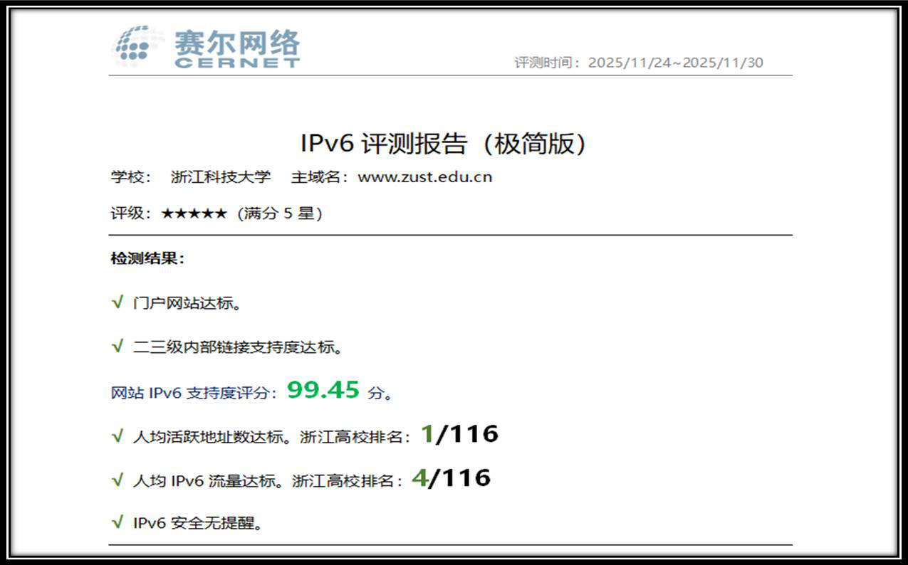 近日,根据机构最新专业评测报告显示,我校IPv6建设的相关指标取得突破,其中人均IPv6活跃地址数位列浙江省116所高校的第一名,人均IPv6流量排名全省第四名,整体获五星(满分)评级。