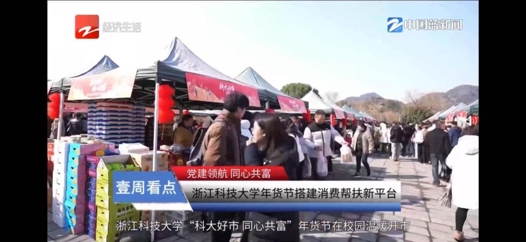 1月8-9日,浙江科技大学“科大好市 同心共富”年货节在校园温暖开市。年货节以党建联建为纽带,搭建“共富桥”消费帮扶新平台。浙江经视、搜狐网等媒体对年货节进行了报道。