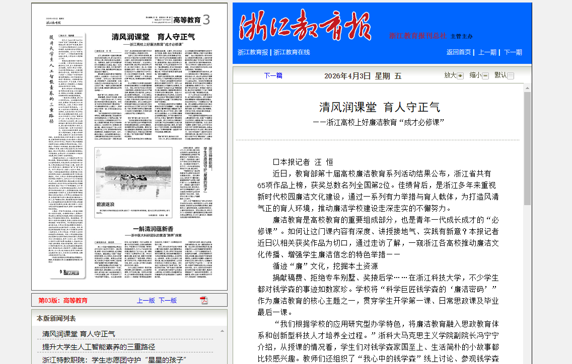 近日,教育部第十届高校廉洁教育系列活动结果公布,浙江省共有65项作品上榜,获奖总数名列全国第2位。佳绩背后,是浙江多年来重视新时代校园廉洁文化建设,通过一系列有力举措与育人载体,为打造风清气正的育人环境,推动廉洁学校建设走深走实的不懈努力。